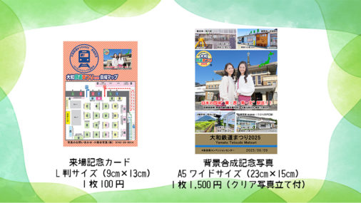 今回のイベントでは、プロのカメラマンがお客様を撮影し、写真入りご来場記念カード(L版サイズ)や、鉄道車両や鉄道の風景等を合成した記念写真(A5ワイドサイズ・クリア写真立て付)に仕上げてプリントし、販売いたします!