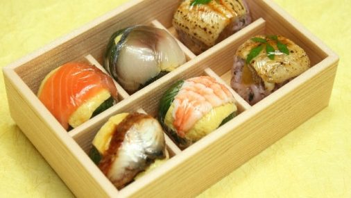 JALのファーストクラスの機内食にも採用された事のある「手鞠わさび葉寿し6個入」