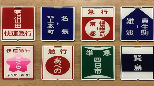 近鉄電車の行先方向幕が装備されるまで使用されていた、行先表示板をアクリルスタンドで再現しました。行先表示板ファンショップ(https://mizutaka.base.ec)で販売しております。近鉄の行先表示板はカラフルで塗分けがバリエーション豊富。見ているだけで楽しいですね。昔懐かしい行先表示板をぜひ。(写真は過去に販売したものです) -