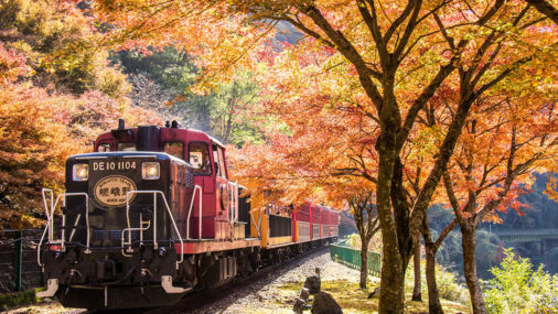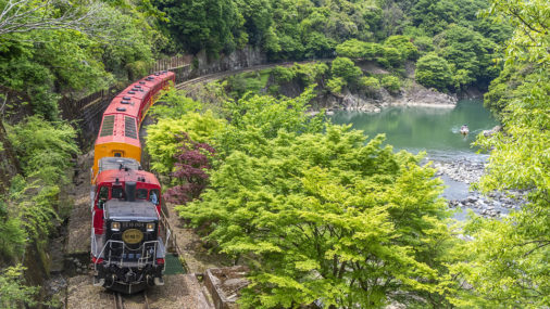 嵯峨野観光鉄道は、複線電化の為に廃線となった旧山陰本線を赤い車体に山吹色と黒の模様のアール・デコ調の列車が、トロッコ嵯峨駅からトロッコ亀岡駅までの7.3kmを25分ほどかけて走る観光列車です。 春の桜に夏の深緑、秋の紅葉&イルミネーション、時には冬の雪景色と四季折々の保津峡の景観や明治時代に造られたトンネルや橋梁など絶景ポイントが満載です。見どころを通過する際には、速度を落として運転するので車窓からの眺めを満喫していただけます。 -
